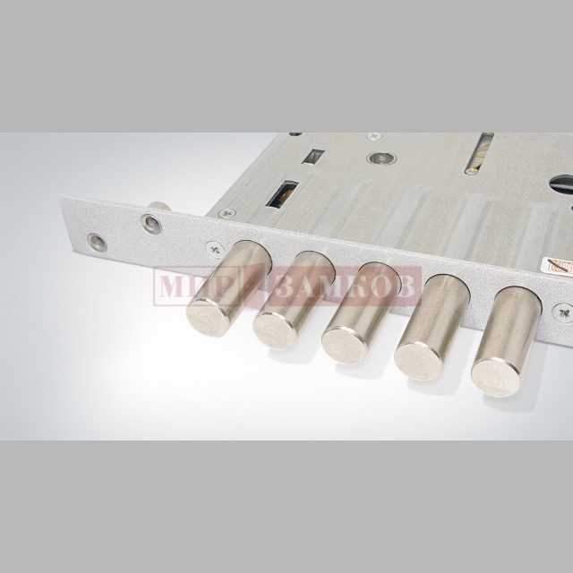 - Замок оборудован надежным засовом, который состоит из четырёх штырей, обладающих диаметром 17,5 мм, и фиксатором, имеющим аналогичный диаметр.