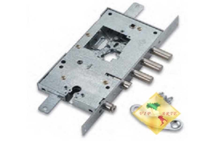Замок комбинированный врезного или вкладного типа установки, может комплектоваться торцевой планкой по желанию покупателя. Верхний секрет на 4 или 3 ригеля представляет собой механизм под сменную нуклию (поставляется отдельно) с ключами. В случае утери или кражи ключей нет необходимости менять замок - достаточно просто приобрести и заменить нуклию. Нижний секрет представляет собой механизм под цилиндр.