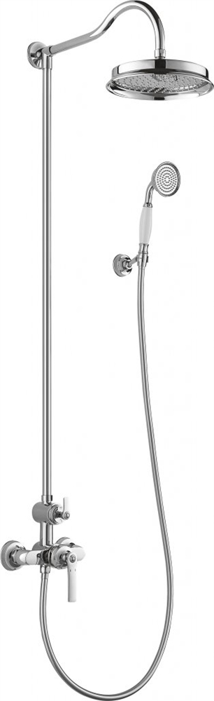 Оснащение: душевая лейка, настенный держатель, кронштейн для верхнего душа, смеситель двухпозиционный, шланг для душа, дивертор
