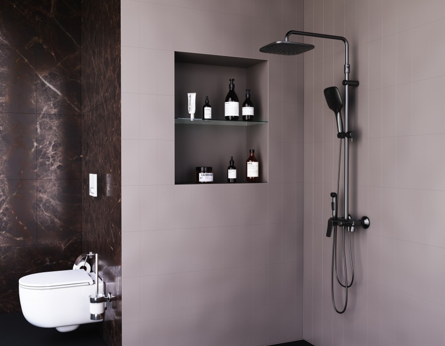 Стиль: сочетание множества аксессуаров душевой системы и трендового черного матового цвета по истине станут стильным атрибутом вашей ванной комнаты.
