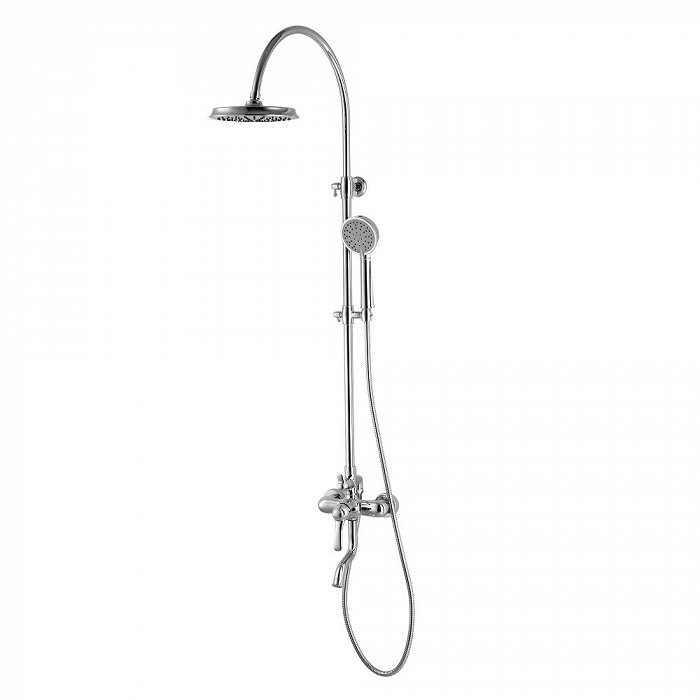 Смеситель для ванны с верхним душем, однозахватный, латунь, цвет - хром, керамический картридж Softap 35 мм, силиконовый аэратор Neoperl; верхняя лейка - 1 режим, диаметр 205мм, ABS-пластик; ручная лейка - 3 режима, диаметр 100мм, ABS-пластик; держатель для ручной лейки - ABS-пластик; 3-х режимный керамический дивертор; шланг из ПВХ в оплетке из нержавеющей стали - 1,5 м; штанга для душа - нержавеющая сталь с возможностью регулировки по высоте. Упаковка: кортонная коробка.