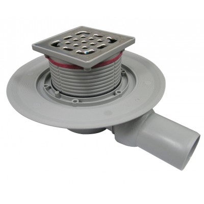 поворотная и регулируемая по высоте насадка 100x100 мм, рамка для установки решетки сделана из пластика, заглушка, штампованная решетка из нержавеющей стали 1.4301, фланец для нанесения/закрепления гидроизоляции, съемное устройство для защиты от неприятного запаха из системы канализации, ввод для подключения дополнительных сантехприборов DN40, выпуск на шарнирном соединении
