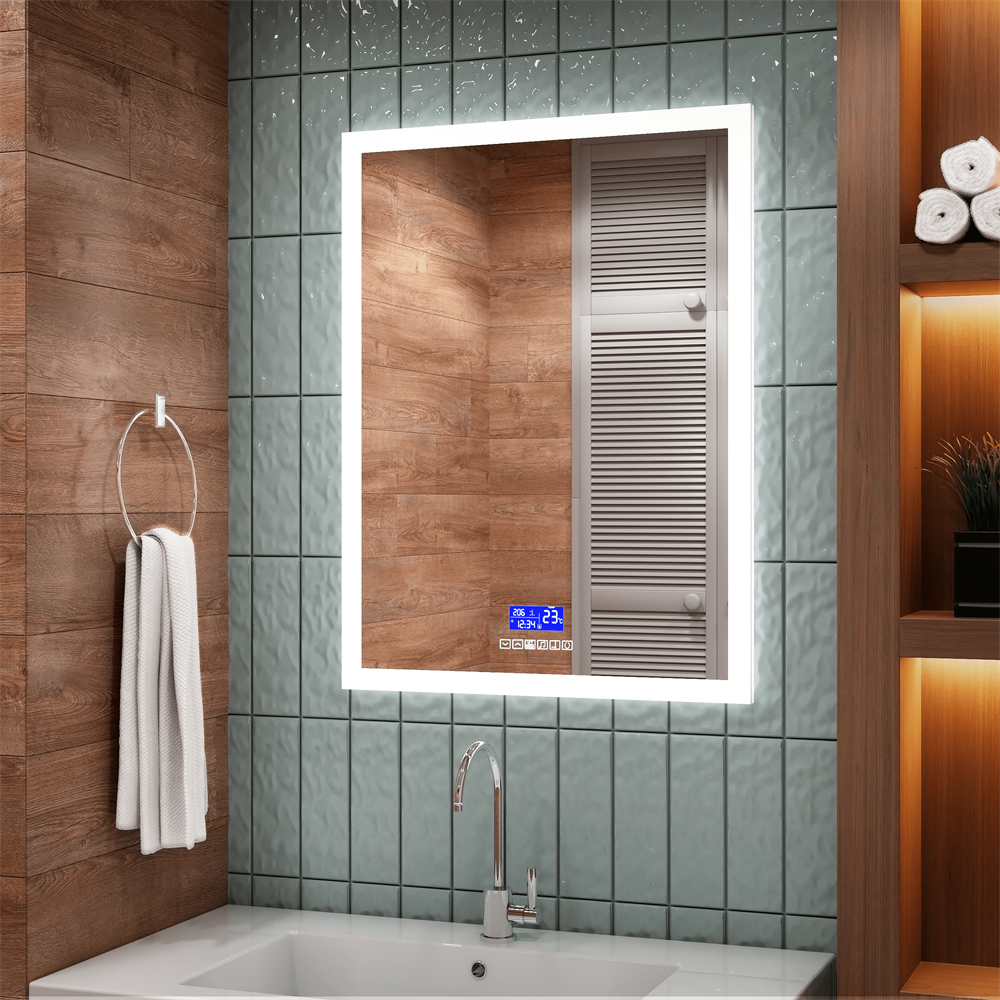 Зеркало для ванной комнаты с LED подсветкой, сенсорным управлением функциями, встроенными часами с индикацией даты, датчиком температуры воздуха, функцией антизапотевания и музыкальной системой. Потребляемая мощность 50 W. Класс защиты IP44.